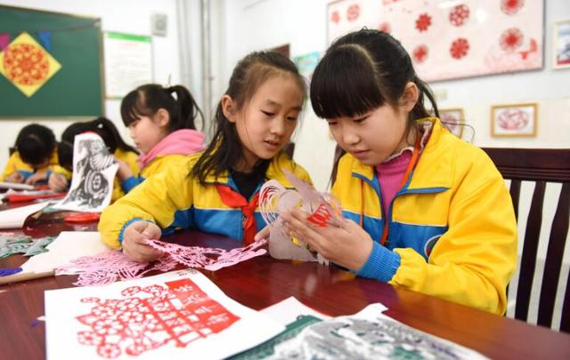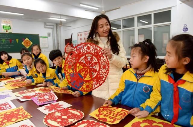 1月22日,南和县新区小学老师在指导学生学习剪纸。