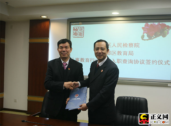 2月27日,广东省广州市花都区检察院与教育局签订《合作“从事教育行业人员入职查询”协议书》,计划对该区所有教育行业人员进行入职查询。