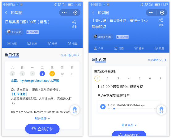 知识圈会记录学生所有作业的打卡内容,形成学习成长记录。当一个学习阶段结束,学生可以回顾自己一步步的进步,加强学生的学习反馈。并且在每日打卡之后,会生成自己的打卡日历,可以让学员分享互动。