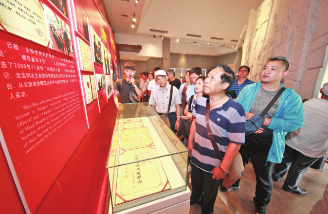 6月28日,在凤阳县小岗村,游客们在参观沈浩同志先进事迹陈列馆。为迎接建党98周年,连日来,来自全国各地的机关和企事业团体,纷纷走进小岗村,开展爱国主义教育活动,传承发扬大包干精神、沈浩精神,喜迎党的生日。 (记者卢志永 摄 滁州网)