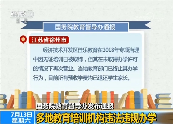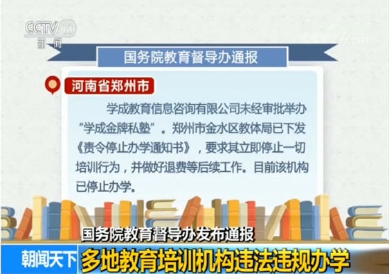 国务院教育督导委员会办公室日前发布通报,针对近期多地发生的校外培训机构违法违规经营的问题,公示查处情况。