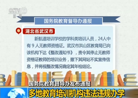 据通报,湖北省武汉市新航道培训学校的学科类培训人员,24人中有9人无教师资格证。武汉市洪山区教育局已向该机构下达《整改通知书》,责令其停止无教师资格证教师的培训业务,撤下其网站不实宣传信息,并将视整改情况确定其年检结论。
