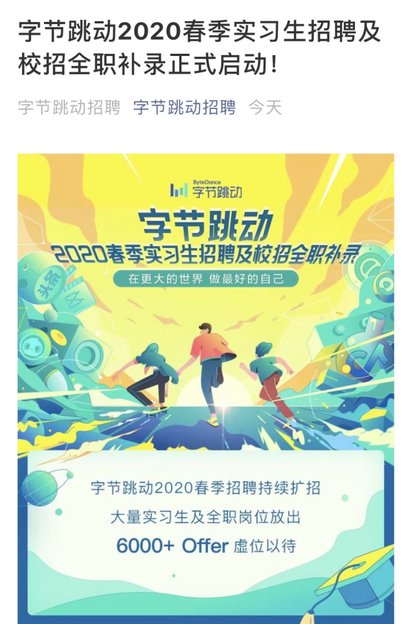 据字节跳动官方招聘号消息,今年春季招聘,字节跳动将继续扩招,为大学生开放超过6000个全职及实习生就业岗位。