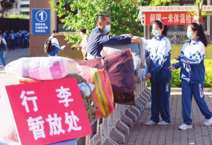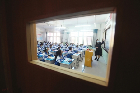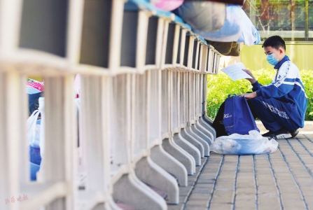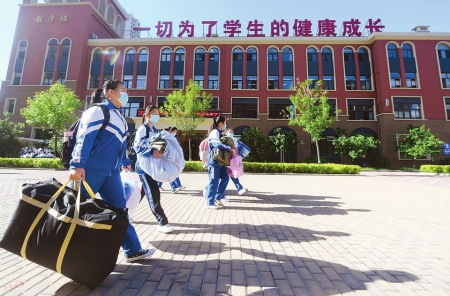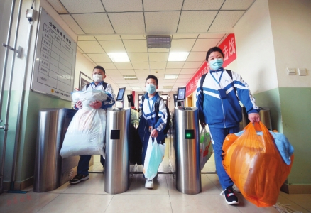 5月11日,太原市十二中富力校区,初一、初二年级共400名学生开学了,学生们分两个时段错峰有序报到,依次排队进入校园,测量体温后提交健康登记卡和承诺书。