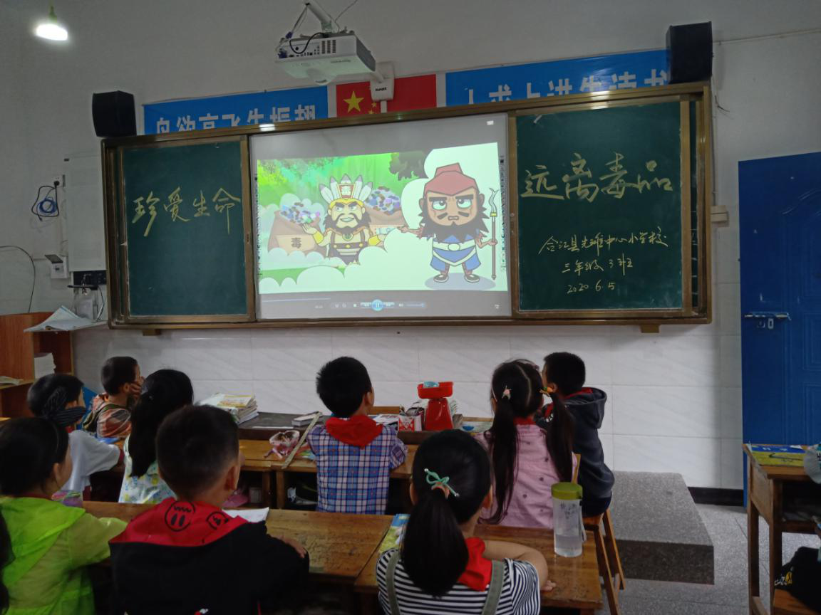 活动分为三个步骤,首先由先滩镇禁毒办工作人员给同学们播放了禁毒动画片《禁毒三国》,并结合动画片讲解了毒品的危害。播放结束后,工作人员结合禁毒实物模型讲解了毒品的种类及危害,着重对摇头丸、奶茶、跳跳糖等新型毒品进行了详细的讲解,并告诫大家不要接受陌生人给的食物及饮料,要时刻提高警惕。