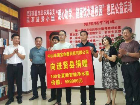 此次捐赠活动是中山市速宝电器科技有限责任公司向进贤县部分乡镇中、小学及幼儿园捐赠了100台夏新智能净水机,总价值达598000元,未来将有效地解决了进贤校园师生饮水不足和饮水安全健康等问题。爱心企业随后将按照分配计划分别去往各个学校,幼儿园进行免费设备安装、调试、售后服务并开展健康饮水知识宣传。通过此次捐赠活动的开展,不仅发挥统一战线力量,还广泛动员了各界社会力量积极参慈善公益与脱贫攻坚工作,更改善了进贤县部分乡镇中、小学、幼儿园饮水健康和饮水安全,扎实推进该县教育扶贫工作。