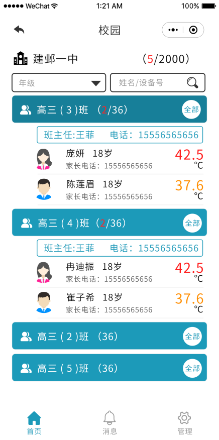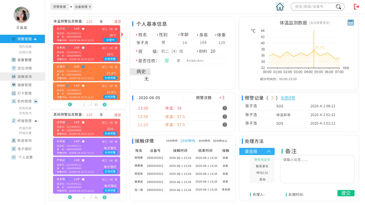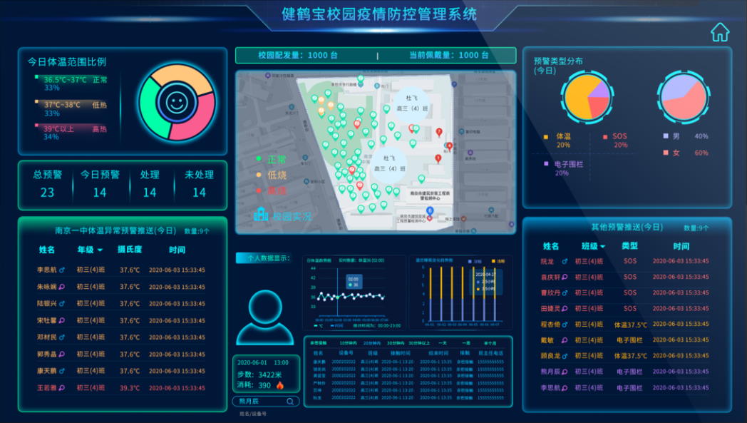 一、校方监管端:可以根据需要查阅各类学生数据,比如每日学生的发热比例、体温异常情况预警、体温异常人员在校园的分布、个人数据查询、SOS电子围栏异常报警以及各种预警所占比例等等。