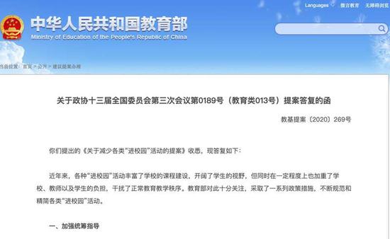 教育部答复指出,2020年9月24日,教育部等八部委联合印发《关于进一步激发中小学办学活力的若干意见》(教基〔2020〕7号),围绕对学校管的太多、干扰太多等突出问题,深化体制机制改革,着力破解影响和制约中小学办学活力的困难和问题,明确提出要落实中小学办学自主权,尤其是要保证学校教育教学自主权,并要求各地要认真落实减轻学校和教师负担的有关规定,切实保障中小学正常教育教学秩序,大力精简、严格规范各类“进校园”专题教育活动,有效排除对学校正常教育教学秩序的干扰。