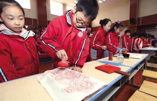 12月8日,西安关中民俗艺术博物院“优秀传统文化”大篷车开进西安市雁塔区红星小学。通过聆听关中民俗故事、积极参与互动问答、亲手拓制木版年画,孩子们对精彩的民俗文化产生了浓厚的兴趣。来源:陕西日报