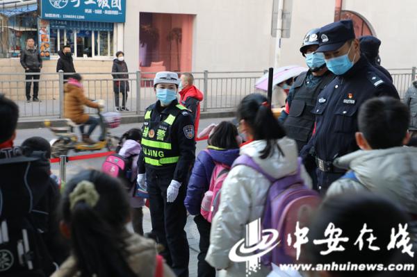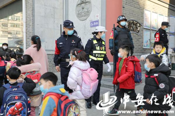 1月19日下午,合肥市公安局庐阳分局逍遥津派出所民辅警与辖区交警共同开展校园“护学岗”任务。