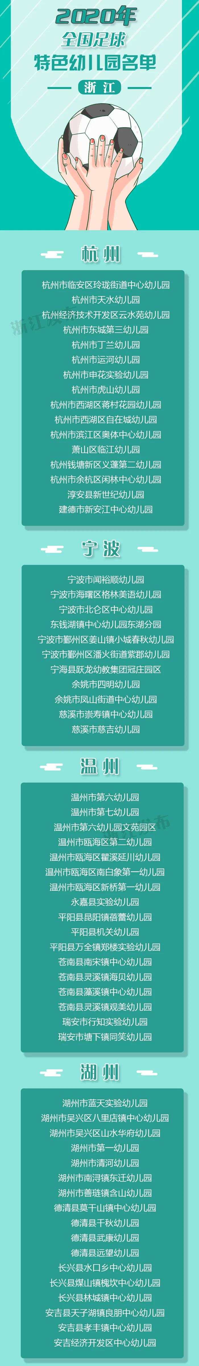 其中,浙江有全国青少年校园足球特色学校121个,全国青少年校园足球试点县(区)和全国青少年校园足球“满天星”训练营各1个,全国足球特色幼儿园147个。来看看有哪些吧!来源:浙江发布