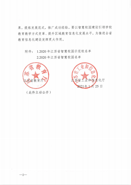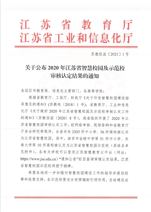 1月28日,江苏省教育厅、江苏省工业和信息化厅联合发布《关于公布2020年江苏省智慧校园及示范校审核认定结果的通知》,我校被认定为“江苏省智慧校园示范校”,荣获江苏省教育信息化领域最高殊荣。