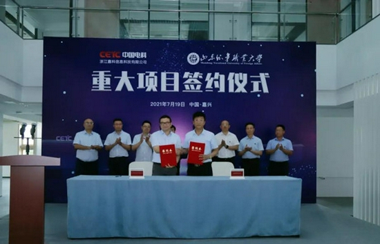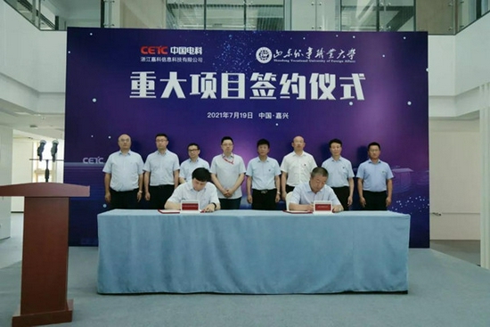 深化智能型产教融合,打造标杆性智慧校园。7月19日上午, 山东外事职业大学与浙江嘉科信息科技有限公司“十四五”战略合作签约仪式暨新闻发布会在中电科(嘉兴)智慧产业园举行。中国电科三十六所副所长兼嘉科信息董事长沈喜明,中国电科三十六所产业部主任管宇辉,嘉科信息总经理陈永骥、副总经理王嘉、智慧教育事业部总经理张皖,山东外事职业大学校长孙承武、副校长王建、党委统战部长左琪、信息化管理办公室主任孙晓范、信息与控制工程学院院长刘法胜及相关媒体代表出席了本次新闻发布会,共同见证了这一历史性的一刻。