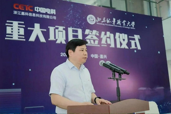 签约仪式上,孙承武校长代表学校致辞,他首先感谢中国电科36所以及嘉科信息公司的邀请,表示很荣幸在中国共产党成立100周年之际,同时也是“十四五”规划的开局之年来到党的诞生地——嘉兴,非常高兴学校能与红船科技铁军展开全面战略合作。他说,作为全国首批职业本科试点院校,山东外事职业大学以职教强国为己任,在产教融合、校企合作等方面不断提升、积极作为。此次与中国电科成员单位嘉科信息公司开展的校企合作,以国家职业教育创新发展高地建设为契机,全面围绕智慧校园、物联网、智慧教室、产业学院建设、校园大数据、精准教育、校园综合管理平台、智慧后勤管理服务平台等十几个大类几十个领域展开深入合作,具有重要深远意义,相信此次合作,必将把山东外事职业大学的信息化建设等各项工作全面推向更新的高度和水平。