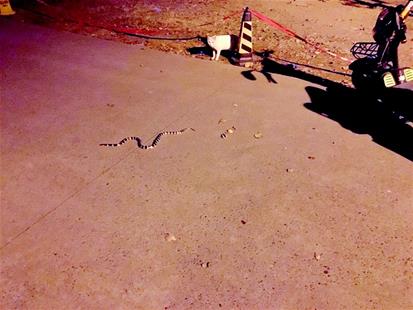 楚天都市报记者在图片中看到,一条蛇在路边爬,这条蛇身上有黑白环状花纹,目测蛇体长1米左右。昨日,楚天都市报记者来到该校韵苑学生公寓,这里有二十多栋宿舍楼,紧邻喻家湖和马鞍山森林公园。