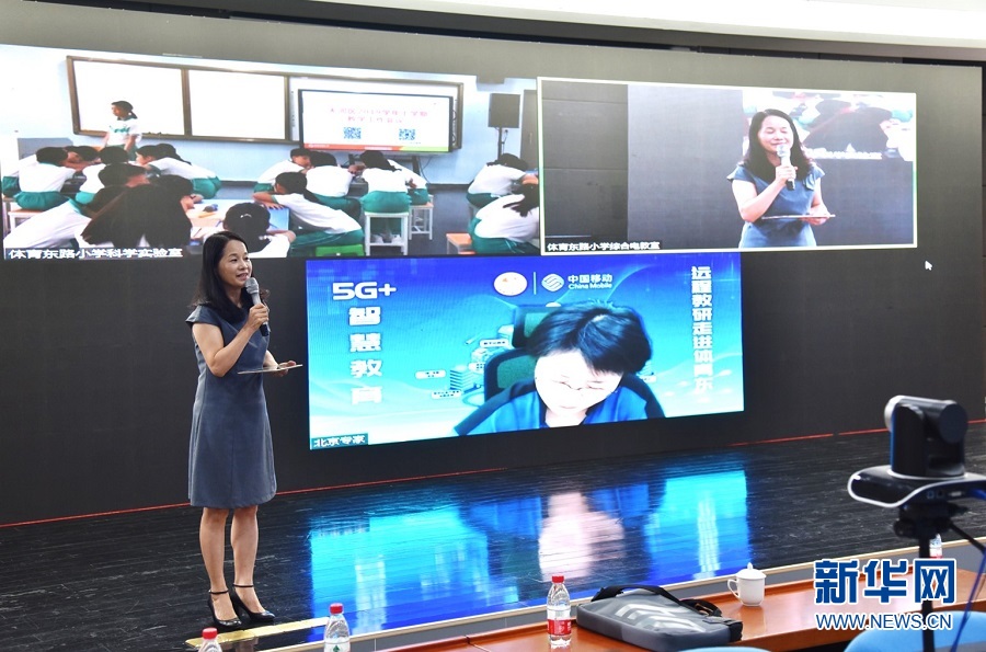 活动现场利用5G传输网络实现三地教学。新华网发