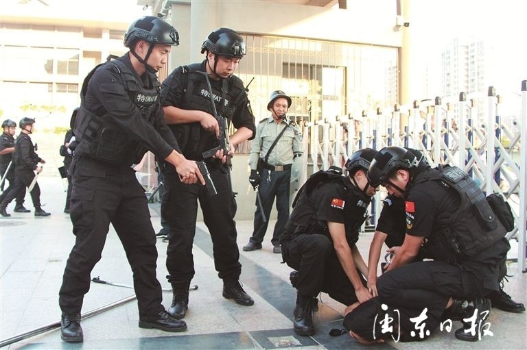 10月21日,由市教育局、减灾委、防恐办、地震局等联合主办的国际减灾日校园综合应急演练活动在蕉城区第一实验学校举行。图为反恐防暴演练。(闽东日报记者 缪星 摄)