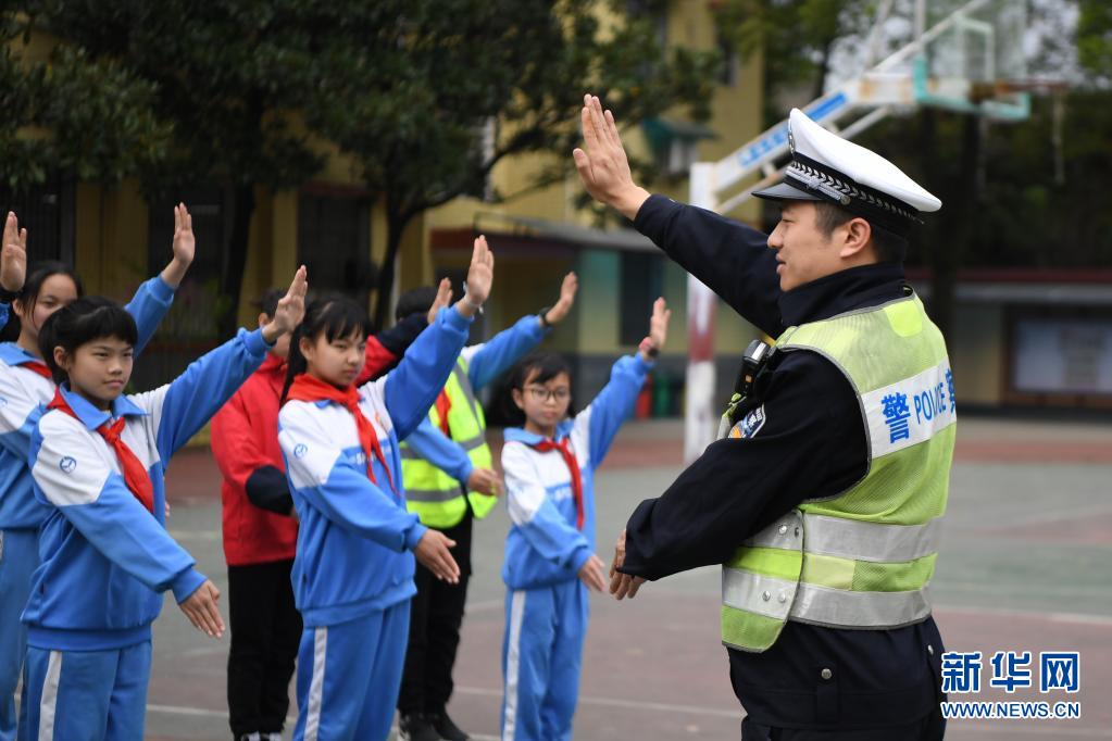 3月26日,交警(右一)在长沙市望岳小学操场指导学生学习交警手势。