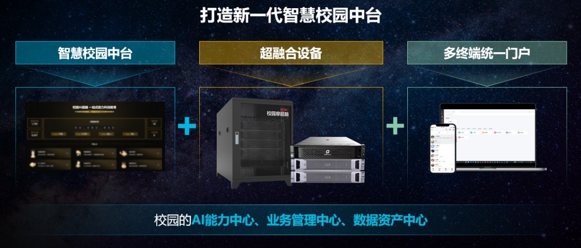 H3C校园摩超脑就是为新一代智慧校园而生的一款产品,集超融合设备、校园中台、多终端统一门户为一体,是校园所有数据和应用融合互通的智慧底座,为学校提供AI能力中心、业务管理中心和数据资产中心,可谓是新建校利器。