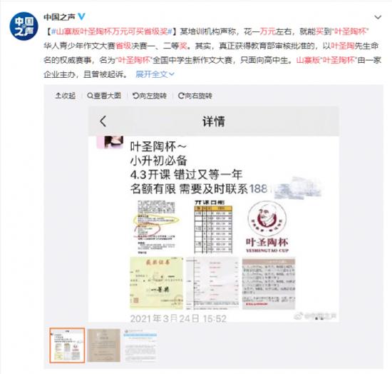 最近#山寨版叶圣陶杯万元可买省级奖#的话题冲上热搜,引发网友讨论。