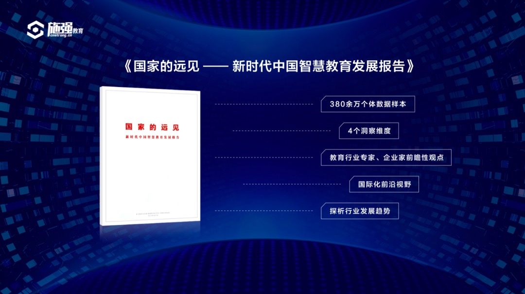4月23日,在第79届中国教育装备展(厦门)上,施强教育举行了智慧教育行业白皮书发布会,发布了由瞭望周刊社出品的《国家的远见——新时代中国智慧教育发展报告》。其中,施强教育为白皮书的制作提供了380余万个个体样本数据及十余年的行业经验。