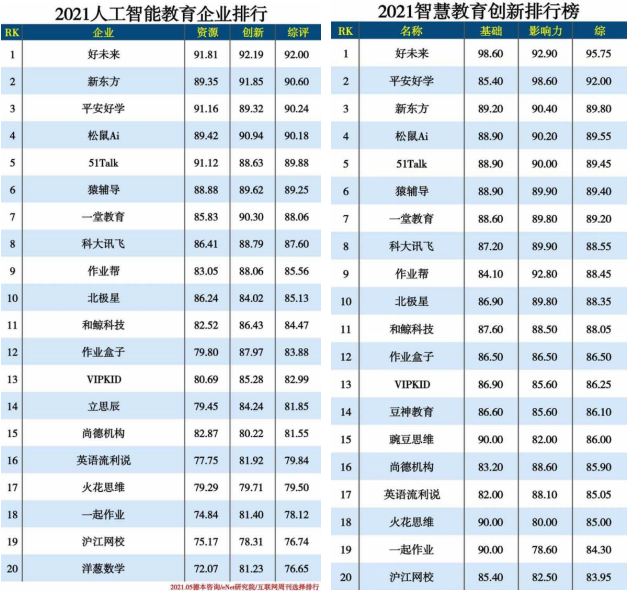 近日,中国科学院《互联网周刊》发布 “2021人工智能分类排行”和“2021智慧教育创新排行榜”,中国平安旗下平安好学凭借突出的创新技术和综合实力再获认可,荣登人工智能教育、智慧教育创新排行榜两项榜单,并均位居前三。