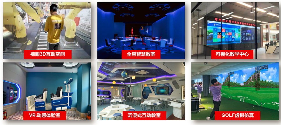 △郑州西亚斯学院智慧教室 郑州西亚斯学院通过打造校内外一体化的智慧校园融合门户和综合性、一站式的服务模式,实现了业务和服务的智能化管理,以高起点的智慧教学体系,实现了更加个性化、智慧化的教学服务,希望通过新型的信息化育人环境,让师生的信息化素养在潜移默化中得到提升。同时,学校专门成立智慧教学领导小组进行智慧教学顶层架构设计,制定智慧教学三年行动计划,建立了以教务科研处为核心、未来教育技术中心引领、信息化处支撑、多部门协同推进的管理体系,从教学环境重构、教学模式创新、教学数据构建、资源建设创新、大数据评价、学生创新能力培养等方面大力开展智慧教学建设工作。 目前郑州西亚斯学院已建成涉及全息教室、研讨型教室、虚拟演播教室、VR教室、裸眼3D教室等在内的11种智慧教室,占比56%。人工智能、虚拟现实、全沉浸式裸眼3D系统等领先技术全面融于教学,实现抬头率和到课率分析、成绩预测、视频资源中英文字幕自动标注、按知识点标记存储、语音检索、无限虚拟空间内容在有限物理空间中展示及人景互动等功能。