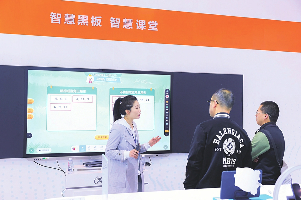 在科大讯飞股份有限公司的展厅,工作人员为参观者展示讯飞AI智慧黑板的操作方法。记者王蕾摄